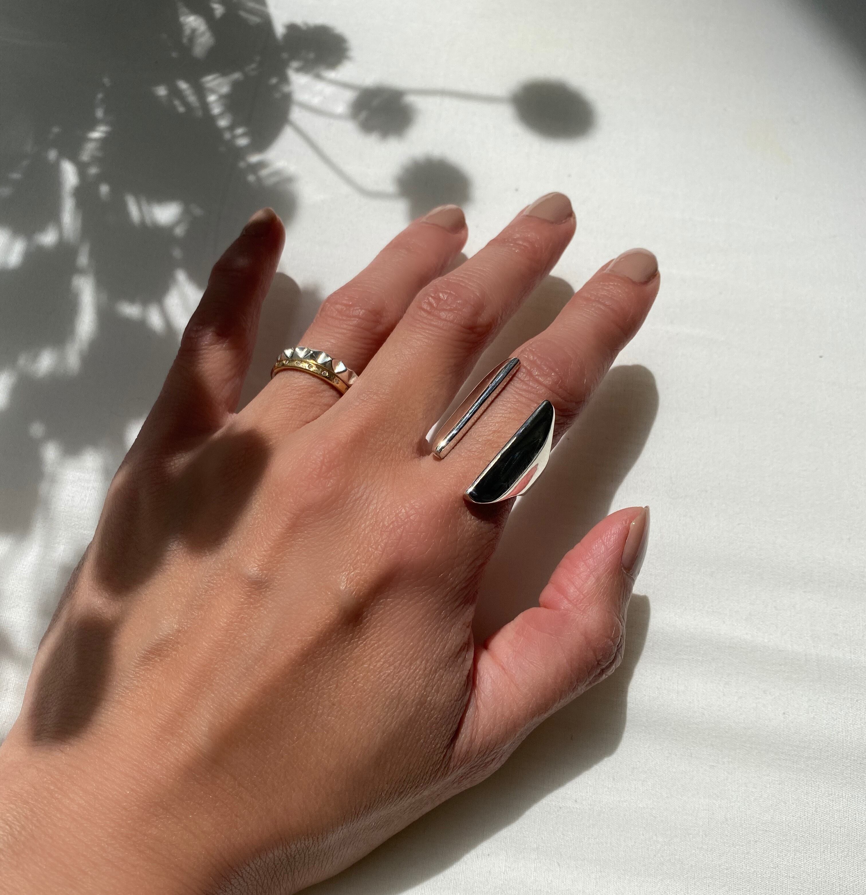 遊び心のあるデザインで指を挟んだような形にしています。アシンメトリーが拘りポイント。 ジャストサイズがおすすめです。 【サイズ】 9/11/13/15 【素材】 silver925 *ご購入いただいてから約1ヶ月でのお届けになります。完全受注生産になります。 *ひとつひとつハンドメイドで生産している為、一点一点の風合いが微妙に違います。 *サイズはデザインの特性状、多少の誤差があります。 ご了承ください。